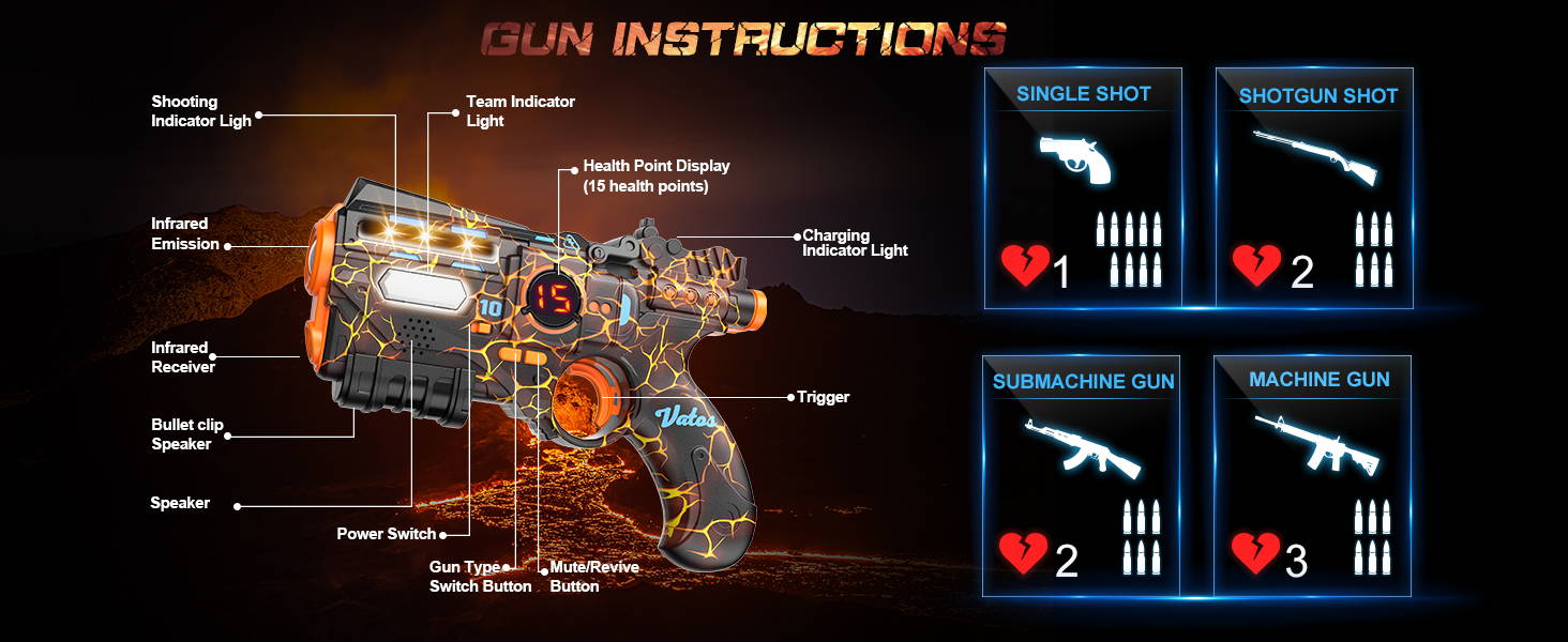 Take your laser tag game to the next level with Stealth Mode, Team or Solo mode, and 4 weapon models(SINGLE SHOT, SHOTGUN, MACHINE GUN and SUBMACHINE GUN) to choose from. which vary in effectiveness and damage. Plus you can reload the gun by simply pushing the clip back which keeps the game fast-paced. The 2.4GHz data sync ensures seamless communication between guns and vests, while the multi-zone targets (chest and gun) make every battle thrilling